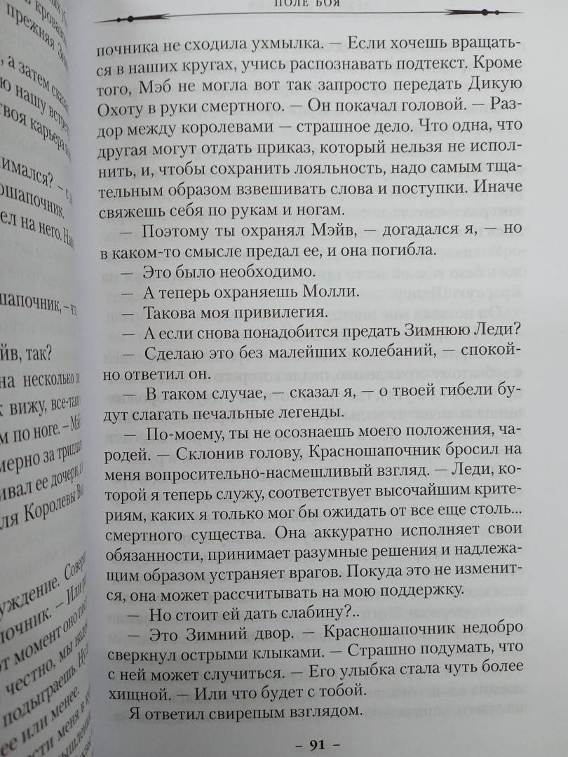 Последний написанный на данный момент роман дополненный рассказом "Сочельник" из цикла Архивы Дрездена, впервые изданы на русском языке. Городское фэнтези напоминающее сериал Сверхъестественное. "Поле боя" прямое продолжение "Ведьминого часа" и лучше читать их подряд. Издание качественное...