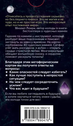 "Чудесные камни. Метафорические карты для поиска верного пути" - новинка от коллекционера Михаила Лоири, автора бестселлера "Чудесные камни. 250 минералов: история, свойства, скрытые особенности". Эта колода собрала 40 самых лучших минералов из коллекции автора, которые обладают настоящей магической силой. Метафорические карты с изображением камней ответят на самые сокровенные вопросы о личной жизни, внесут ясность в случае неразрешимых проблем, предостерегут от трудностей и укажут верный путь. Гадание по камням, или литопрогноз, помогает разбудить подсознание человека, чтобы он смог услышать советы старших товарищей, которые существуют на земле миллионы лет. Дополнительная информация в конце колоды станет подтверждением мудрости каждого камня, ведь благодаря интересным фактам в приложении вы сможете узнать, какие легенды слагались о минералах и почему именно к их прогнозам стоит прислушаться.