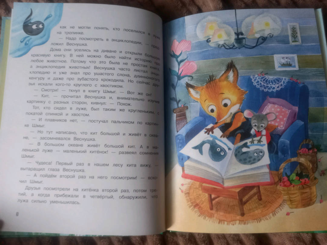У наших старых знакомых лисенка Веснушки и мышонка Шмыга новые удивительные события. Теперь они нашли в лесной луже настоящего... кита. Ну да, только маленького. А как бы большой кит мог поместиться луже? Большой кит живет в океане, а маленький – в луже.