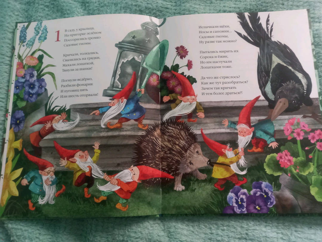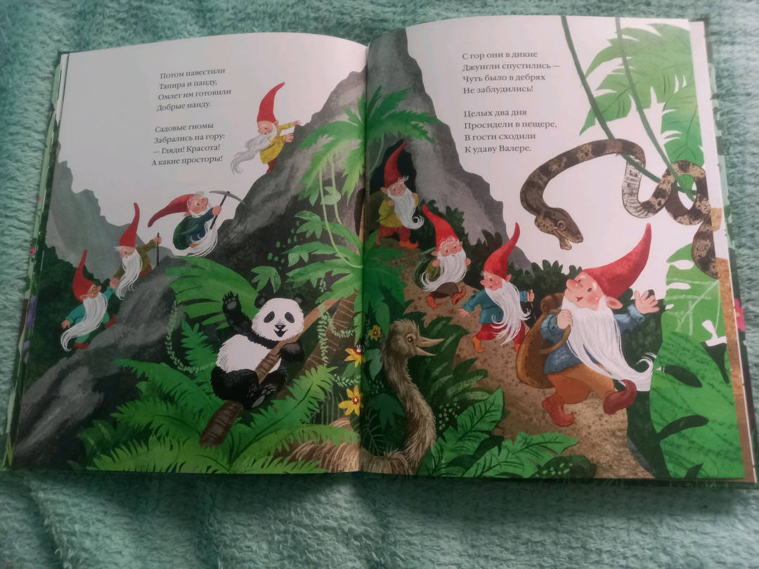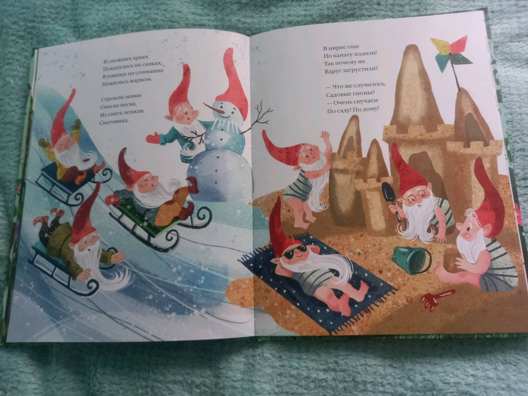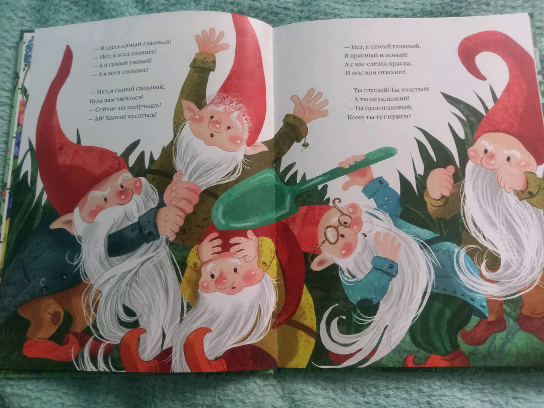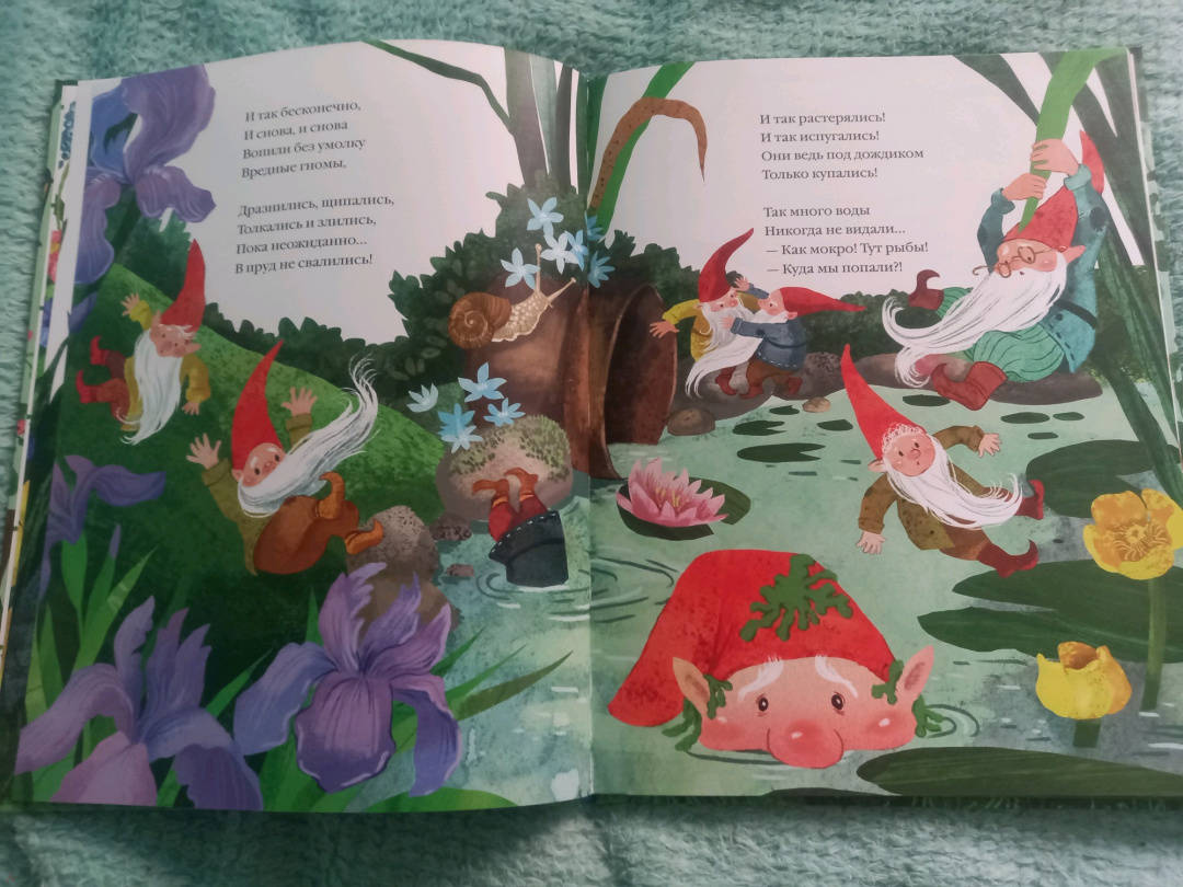 Книга выглядит волшебно, очень красочно и красиво. Она большого формата с мелованными листами. А внутри стихотворная история про милых гномиков, сопровождения просто невероятными иллюстрациями. Уютно, забавно и идеально для совместного чтения