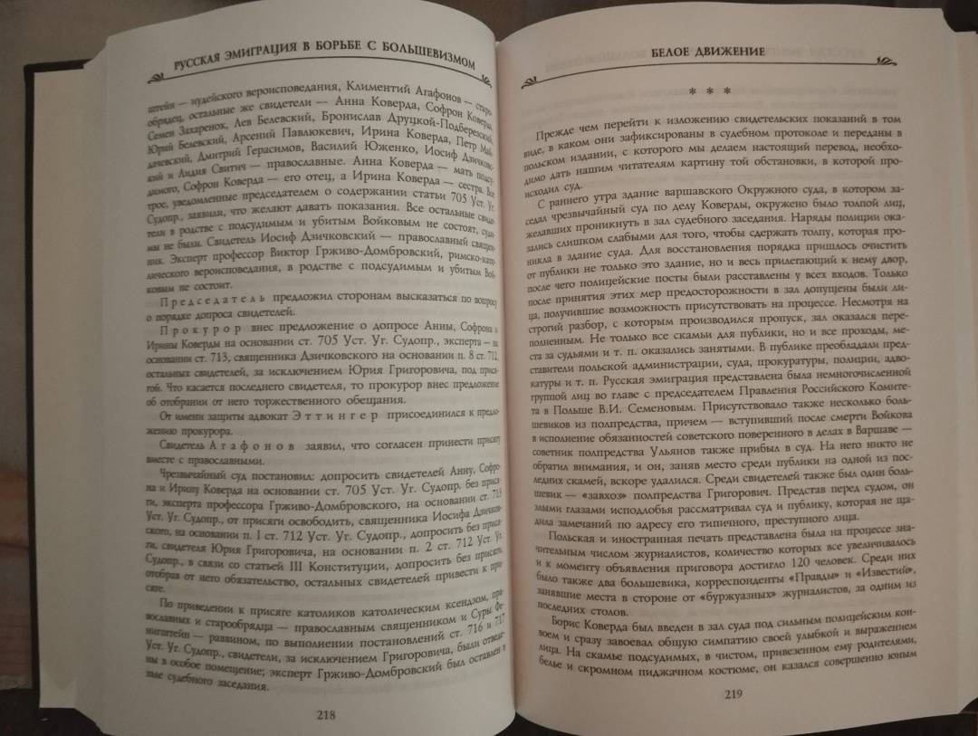 Значительное место в книге уделено описанию известной операции "Трест", но со стороны белых, и истории Боевой Организации генерала А.П. Кутепова. Особый интерес представляет и описание дела Б. Коверды, убившего на перроне Варшавского вокзала советского дипломата Войкова. Войков был убит не как посланник, а как "член коминтерна и за Россию", - говорил на процессе Коверда.