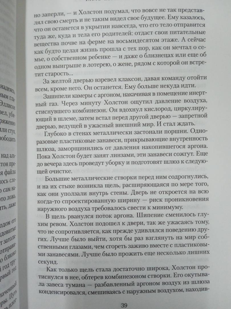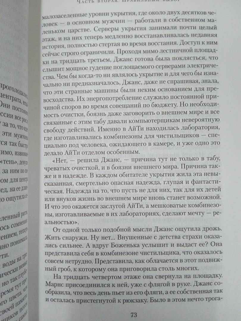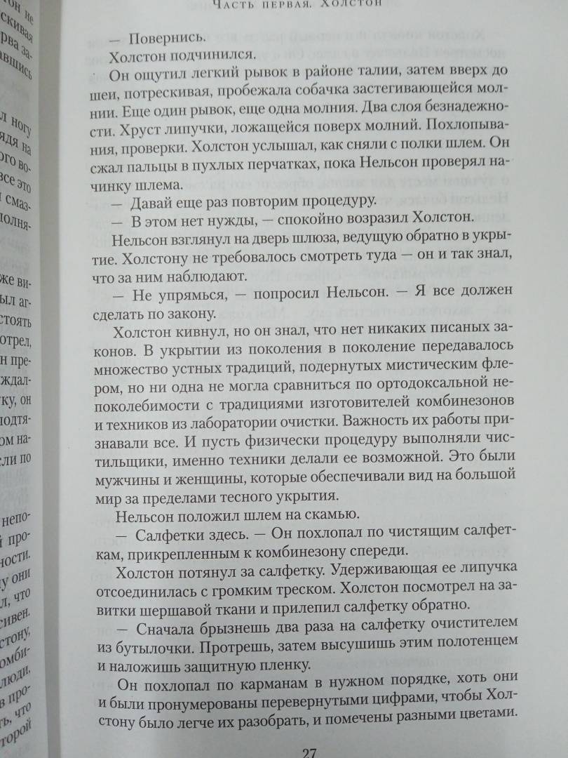 Люди живут в огромнейшем искусственном бункере-укрытии. Из поколения в поколение. Выход наверх, наружу смертельно опасен. "Добровольцы", которые отправляются время от времени на очистку, то есть протирать линзы камер наружного наблюдения, через короткое время умирают. Жизнь в укрытии строго регламентирована. Кастовая система. Если ты носильщик, то никто другой не имеет права переносить грузы с уровня на уровень. Если ты работаешь на генераторе, поставляющем энергию на все уровни, то не можешь заниматься ничем иным. А уж тем более работаешь в секторе АйТи, святая святых системы, главном поставщике информации об окружающем мире. Правда, никто не знает, так ли уж правдива поставляемая сектором информация, а персонал АйТи не допускает посторонних в свои владения… В мае 2023 года состоялась премьера первого сезона телесериала "Укрытие", снятого по роману Хауи (режиссеры Адам Бернштейн и Мортен Тильдум по сценарию Грэма Йоста). Сериал пользовался огромной популярностью, получил высокие рейтинги и уже продлен на второй и третий сезоны. Книгу дополняет рассказ автора о том, как по роману снимали популярный телесериал.