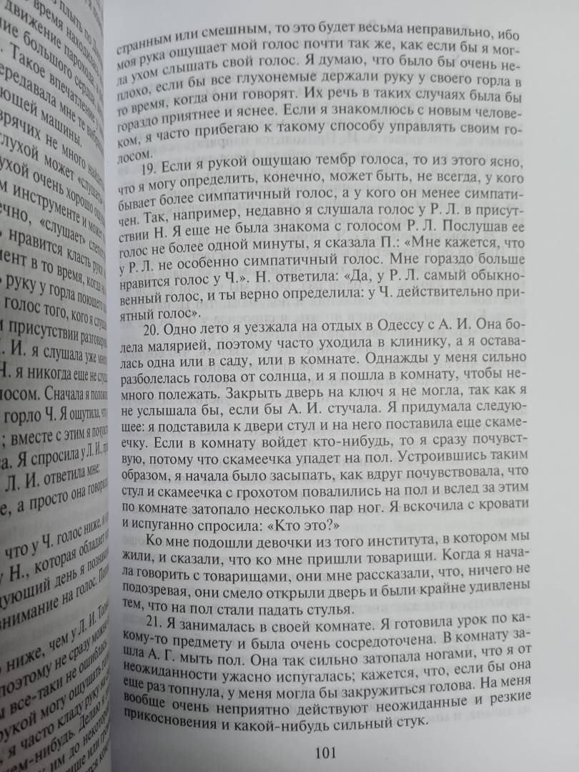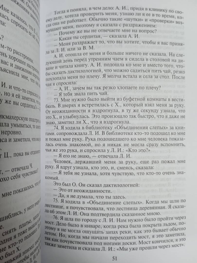 Автор книги - человек необычной судьбы. В детстве она заболела менингитом и полностью потеряла зрение, а затем и слух. Примерно в десятилетнем возрасте она попала в школу-клинику для слепоглухонемых детей, где под руководством профессора И. А. Соколянского у нее была восстановлена речь. Здесь же она