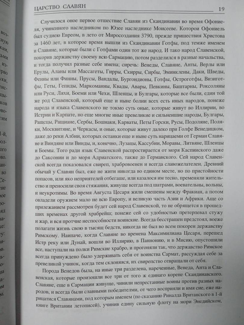 Когда первое издание книги вышло в Европе, сразу разразился скандал и книгу запретили. Уникальное издание вышло в переводе 1722 г., выполненном выдающимся российским дипломатом Петровской эпохи сербом Савой Лукичем Рагузинским-Владиславичем. Книга публикуется в приведенном к современным литературным нормам варианте. Cтатья-комментарий и постраничные примечания помогут читателю понять историческое исследование далматинского монаха, написанное в непривычной для нашего времени манере. Сенсационное и необыкновенно масштабное, оно не опровергает, а, напротив, утверждает полузабытые средневековые свидетельства о предках славян, находящие неожиданные аналогии в смелых гипотезах и открытиях современных ученых.