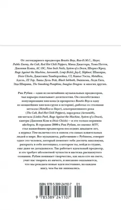 Рик Рубин - один из величайших музыкальных продюсеров, чья карьера охватывает десятилетия. Он способствовал популяризации хип-хопа (и превратил Beastie Boys в одну из мощнейших хип-хоп-групп в истории), работал со столпами металла (Metallica и Slayer), альтернативного рока (The Cult, Red Hot Chili Peppers), хард-рока (Aerosmith), ню-метала (Linkin Park, Rage Against the Machine, System of a Down), кантри (Джонни Кэш и Dixie Chicks) - и это только вершина айсберга. В середине 2000-х Рик Рубин, по оценке MTV, стал важнейшим продюсером последних 20 лет, а журнал Time включил его в список ста самых влиятельных людей в мире. Все музыканты, работавшие с Рубином, говорят одно: это человек, который помогает тебе достичь максимума, раскрыть в себе потенциал, о котором ты, войдя в студию, еще даже не догадывался. Так работает идеальный продюсер, и это требует абсолютной чуткости и настежь распахнутого сознания. Рубин понимает творчество, как мало кто на свете, учит нас творить из ничего, и внезапно оказывается, что мы рождаем новые идеи постоянно, на каждом шагу, чем бы ни занимались.