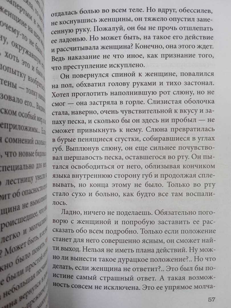 Ники Дзюмпей, скромный энтомолог-любитель, хотел провести на побережье три дня отпуска и пополнить свою коллекцию жуков и бабочек. Вместо этого он оказался в ловушке - в яме среди безбрежных песков, в доме, построенном на песке. Здесь живет женщина, которая день и ночь сражается с этим неумолимым песком, грозящим засыпать дом. Этот песок - словно сама смерть, сама безысходность, он стирает в пыль всякую надежду, но требует ежедневной битвы с собой. И в его глубине таится жизнь-вода...