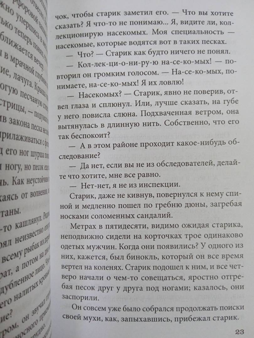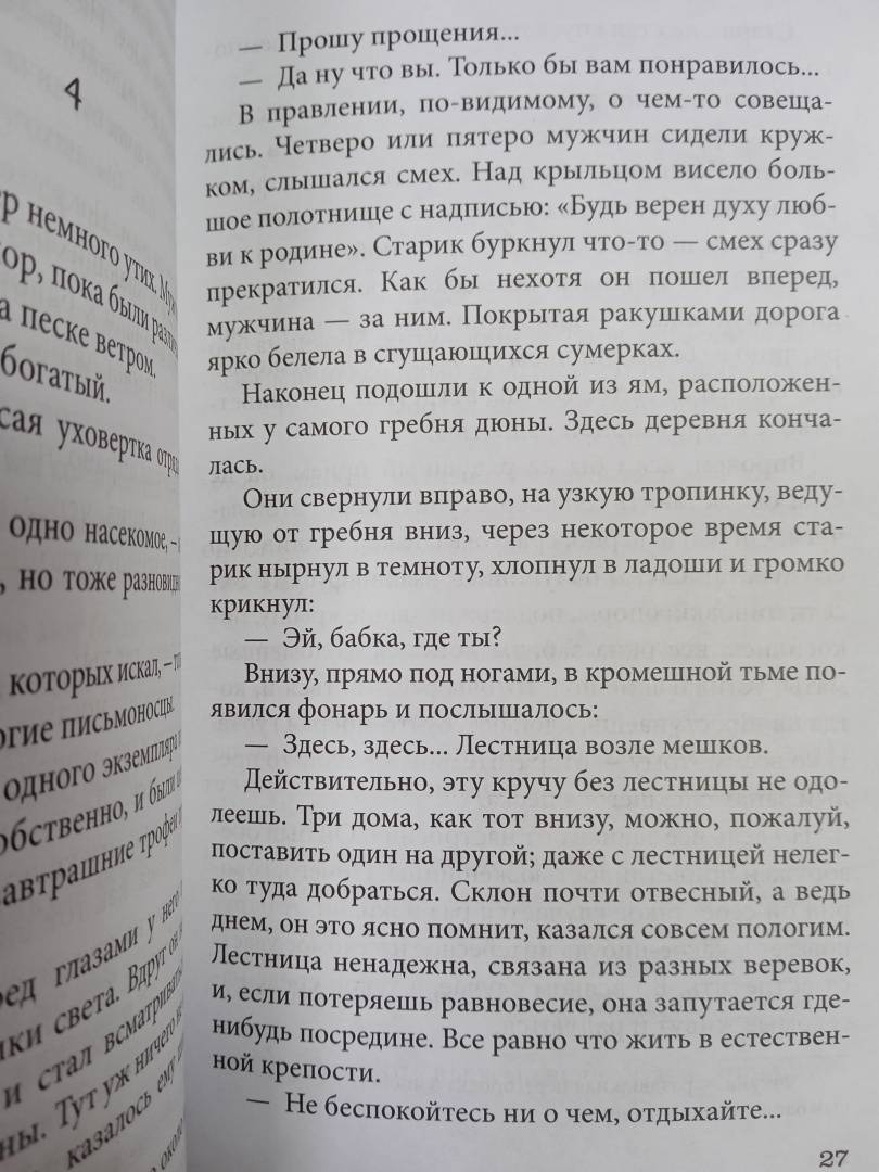 Ники Дзюмпей, скромный энтомолог-любитель, хотел провести на побережье три дня отпуска и пополнить свою коллекцию жуков и бабочек. Вместо этого он оказался в ловушке - в яме среди безбрежных песков, в доме, построенном на песке. Здесь живет женщина, которая день и ночь сражается с этим неумолимым пе