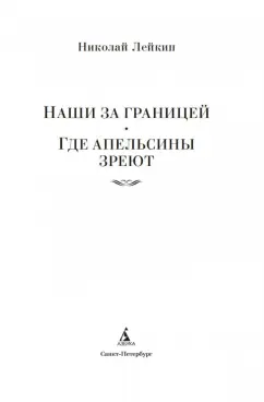 Николай Александрович Лейкин - в свое время известный петербургский писатель-юморист, журналист, издатель. Его популярность была колоссальной: "эпохой Александра III и писателя Лейкина" назвал конец XIX века поэт А. Блок. А. П. Чехов считал Лейкина своим "крестным батькой": с начала 1880-х годов Лейкин издавал собственный журнал - юмористический еженедельник "Осколки", к сотрудничеству в котором привлек молодого Антона Чехова, раскрыв его талант. Книга "Наши за границей" - одна из самых известных в творчестве Лейкина. Это веселое повествование о поездке купца Николая Ивановича Иванова и его жены Глафиры Семеновны во Францию - на знаменитую Всемирную выставку в Париже. Книга настолько понравилась читателям (только при жизни автора она выдержала 24 издания!), что Лейкин написал продолжение - "Где апельсины зреют", в котором купеческая чета решает побывать на Французской Ривьере и в Италии. Лейкинский мягкий юмор по отношению к соотечественникам, отправившимся мир посмотреть и себя показать, и сегодня не утратил актуальности.