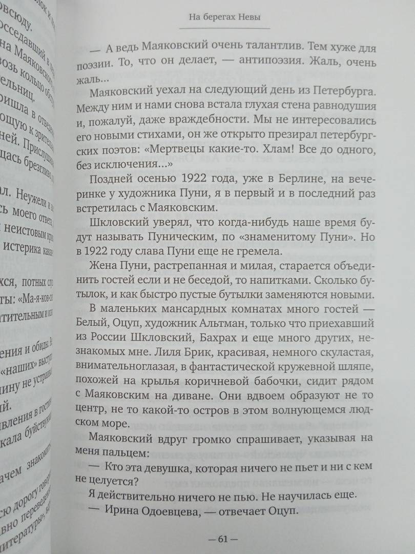 "Я пишу не о себе и не для себя, а о тех, кого мне было дано узнать… Я пишу о них и для них. О себе я стараюсь говорить как можно меньше…" - написала в предисловии к своим мемуарам Ирина Одоевцева - русская поэтесса, любимая ученица Николая Гумилева, в 1922 году покинувшая Россию. Она прожила долгую жизнь и вернулась на родину в 1987 году - последняя представительница далекого Cеребряного века. Ее воспоминания "На берегах Невы" были изданы в России в конце 1980-х годов колоссальным тиражом - 150 000 экземпляров и были восприняты как откровение. И в наши дни эта книга - памятник эпохе, ее живое свидетельство - читается с огромным интересом. На ее страницах предстают Николай Гумилев, Анна Ахматова, Георгий Иванов, Осип Мандельштам, Владимир Маяковский... Феноменальная память Одоевцевой позволила ей и через много десятков лет воспроизвести разговоры, дискуссии, споры того времени.