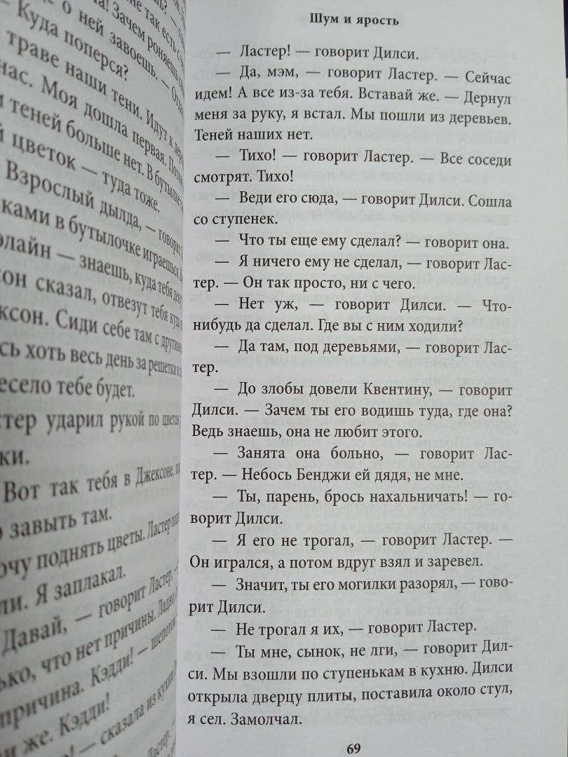 Эта притча о поиске смысла в бессмысленном мире погружает читателя в хаос человеческой души, почти осязаемо транслируемый со страниц романа. Сквозь призму времени, смутных воспоминаний и утраченных иллюзий раскрывается трагедия семьи Компсон - наследников исчезающей аристократии американского Юга. Каждая из четырех частей произведения представляет собой уникальный взгляд на мир одного из героев, в котором переплетаются прошлое и настоящее, собираясь в сложную мозаику человеческих переживаний и бесконечно адресуя читателя к размышлениям шекспировского Макбета, которому роман обязан своим названием: "Жизнь... - рассказ безумца, полный ярости и шума, лишенный смысла".