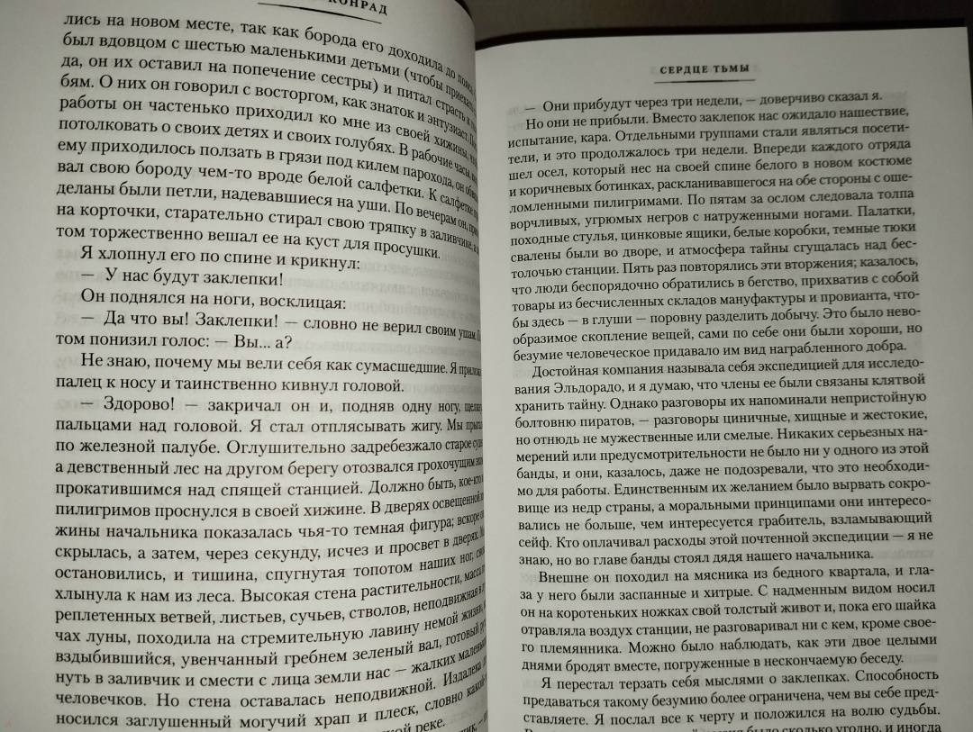 "Сердце тьмы" - безусловный шедевр, погружающий в неразгаданную бездну человеческой природы, обнажая скрытые в ней тени. Упорные поиски загадочного торговца слоновой костью, засевшего в глубине джунглей, ведут рассказчика в верховья реки Конго, и по мере продвижения в джунгли он сам и его окружение все больше теряют связь с реальностью, проникая во тьму, что таится в человеческом сердце.