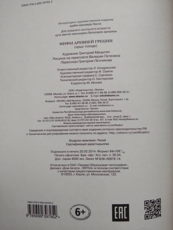 Размер книги 20,3*26,3*2,8см. Хорошая книга для домашнего чтения. А4 и объемная, как энциклопедия. Не поленилась взвесили книгу на кухонных весах 1071гр. В конце книги перед содержанием есть Генеалогическое древо богов и героев древнегреческой мифологии. На 260 странице словарь с разъяснениями, кто есть кто, пояснения...
