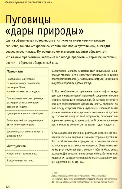 Если это ваша не первая книга по рукоделию, то эксклюзивные техники из неё вряд ли извлечёте. Половина книги - довольно банальные вещи: пуговицы, расшитые бисером, вышивкой, обвязаные, обтяжные, деревянные, пуговицы-помпоны из пряжи. Кого этим удивишь? Есть некоторые оригинальные вещи, но они требуют специальных мате...