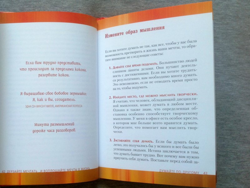 Во-первых, книга совершенно невероятная по оформлению! Объемные буквы на обложке. Внутри – высочайшего качества бумага и невероятная красота! Вау! Просто ШЕДЕВР!!! С таким оформлением книгу смело можно покупать в подарок. Что касается содержания – в книге масса полезных идей для мотивации и личностного роста, как и ...
