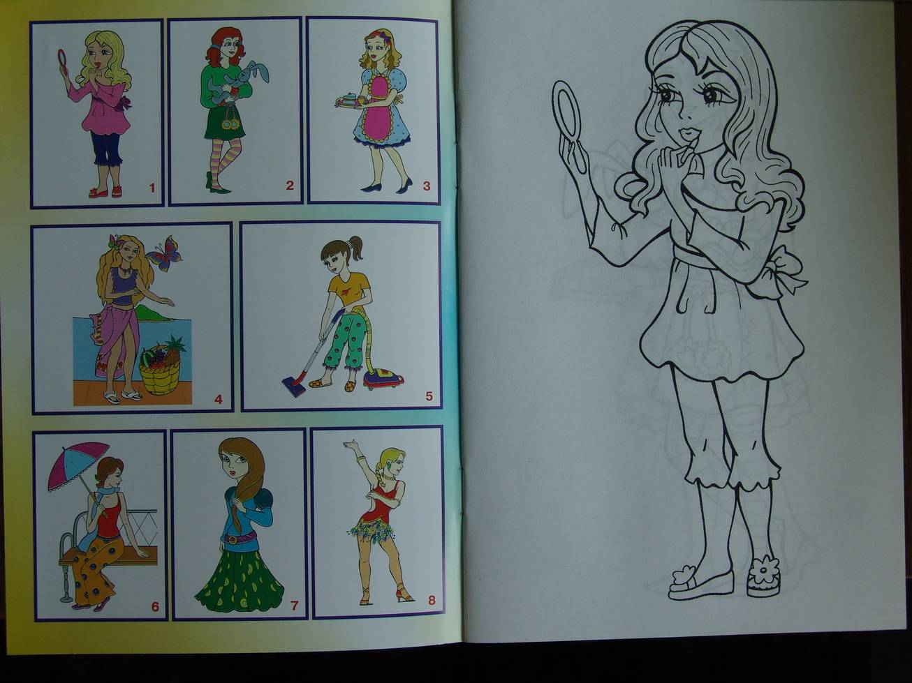Раскраска не плохая. В ней 16 рисунков - девочки, выполняющие разные дела: красит губы, несет пирог, убирается, танцует, гладит и т.п. Сами рисунки мне не очень понравились. У девушек в основном лица одинаковые, а на некоторых картинках у девушек голова непропорционально большая. Рисунки крупные, но содержат много мел...