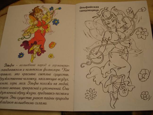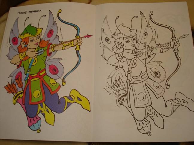 Очень красивая раскраска с картинками эльфов. Собраны эльфы в разных воплощениях: эльфийская танцовщица, принц эльфов, принцесса эльфов, эльф-лучник, эльф-трубник, эльф-мудрец, хранительница нектара, эльф-музыкант, эльф-сластена. Рисунки на всю страницу, к каждому приведен цветной образец. Рисунки сложные, с множество...