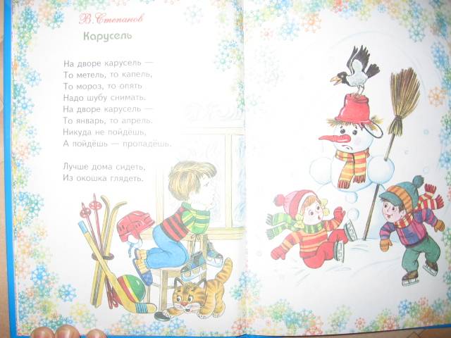 Приятная книжечка, ни чем особо не отличается от остальных, про новый год. Тут и песенки, и самые разноплановые стихи: от Пушкина до Степанова. В иллюстрациях также нет единого стиля: на одном развороте могут оказаться качественные, красивые иллюстрации и компьютерные безликие.