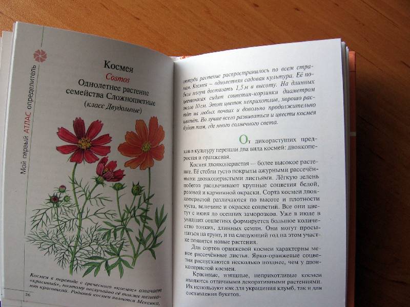 Атлас формата меньше А4, удобно брать с собой. Обложка твердая, страницы белы плотные. Спарава дано описание цветка(откуда завезен, как произошло название, длина в см, где распространено, сорта и т.д.), слева указано название, много-или однолетнее, семейство, класс, четкий рисунок цветка.