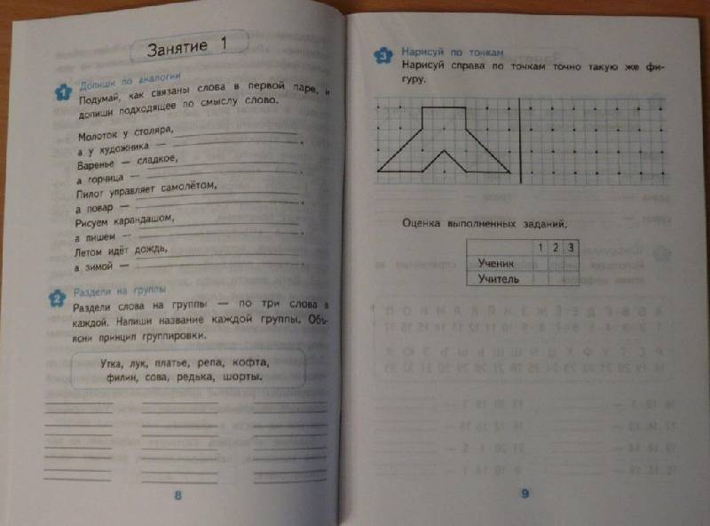 Мы по этой тетради готовились к школе.Подобные вопросы задавали на собеседовании при записи в школу. Каждое занятие состоит из 3 заданий.Очень понравилось, что каждое задание оценивает и ученик, и учитель, для этого есть специальные таблички.Не всегда у нас мнение по поводу отметок совпадало, но ближе к концу занятий ...