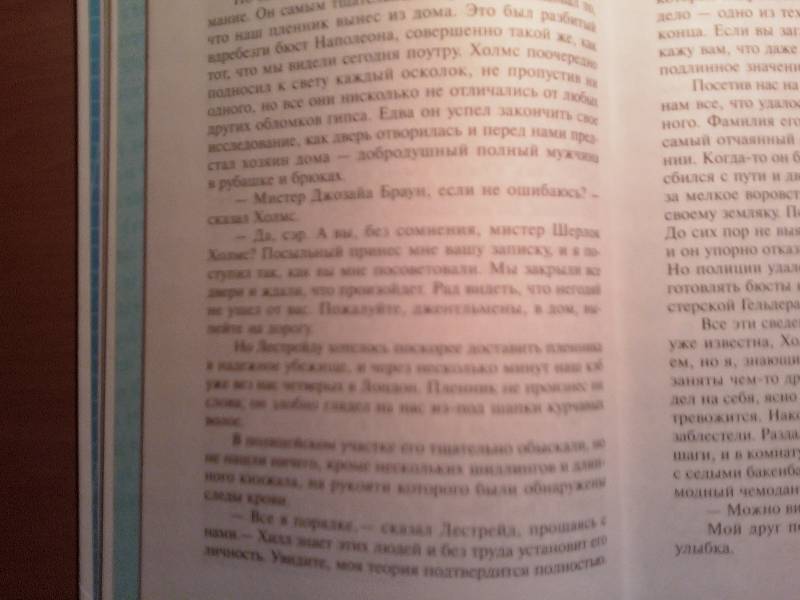 С удовольствием читаем книги серии "Школьная библиотека" издательства "Самовар". Уже собралась небольшая библиотечка. Книга "Рассказы о Шерлоке Холмсе", как всегда в "фирменной самоваровской" обложке, отпечатана на белой бумаге (но немного просвечивает). Иллюстраций немного (около 20), зато много текста за счет некрупного шрифта: (тех книг, в которых много рисунков и крупный шрифт хватает на один вечер, а эту растянем на недельку!). Хотя ребенок читает...