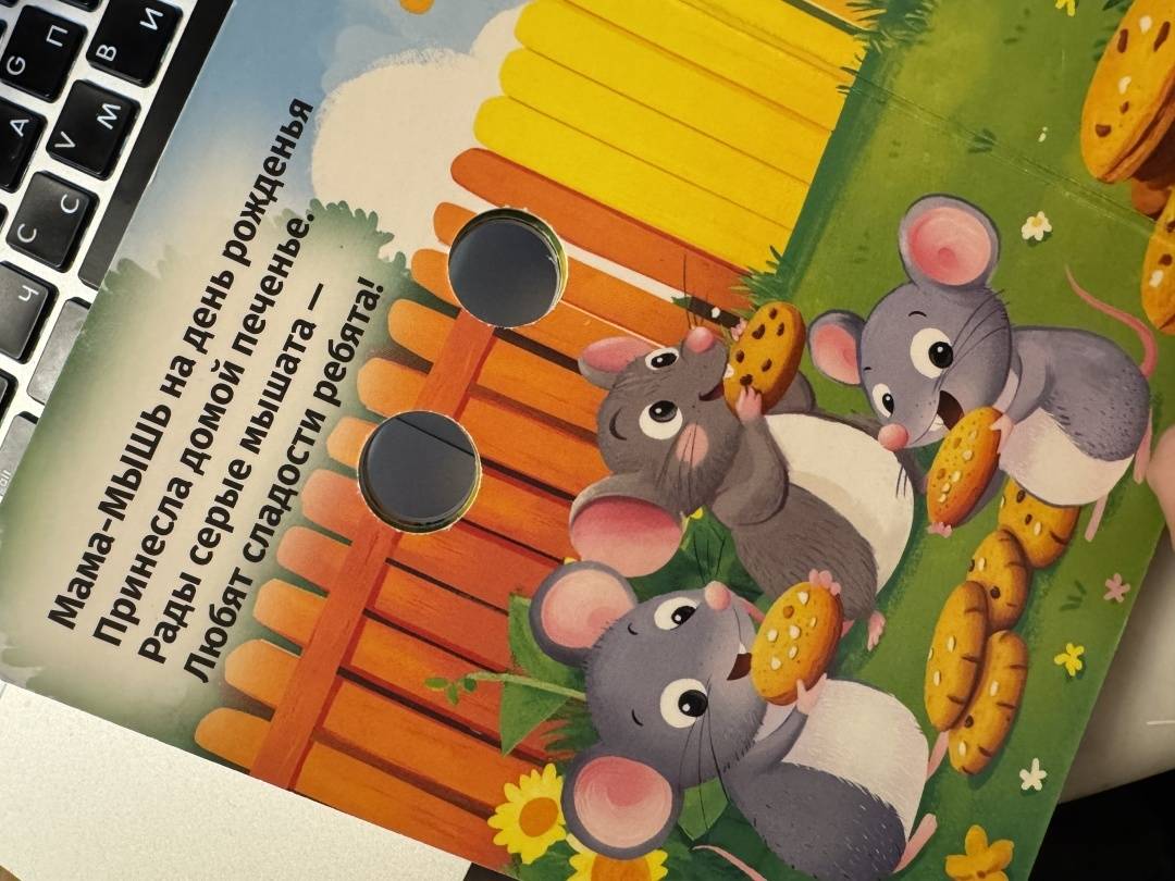 Меня смутило очень, что мышь на день рождеНЬЯ получила печенье. Хотелось бы, чтобы даже в книжке для малышей писали грамотно. А то странные стихи, которые коверкают русский язык.
