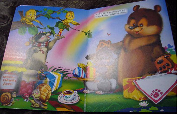 Книга из плотного картона, краски яркие, рисунки четкие и очень добрые! Знакомит с многими животными медведь, утка, белочка, заяц, кузнечик, улитка, бабочка, божья коровка, ёж, мышь и так далее. Текста мало, в основном картинки.