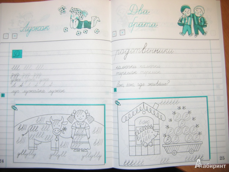 Помимо крючочков, букв, слов и предложений, в тетради предложены рисунки для прописи с элементами букв. Маловато линеечек для самостоятельного прописывания. Приходится использовать обычную тетрадь в косую линейку. И, самое главное, предлагаемые буквы уж очень странно угловато выглядят.