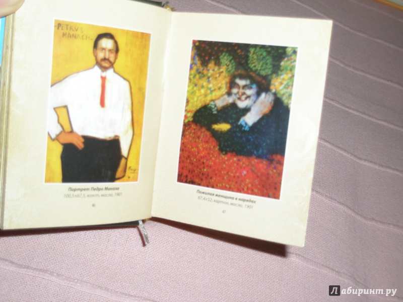 Книга очень красиво и качественно оформлена (закладка, позолоченные края страниц, твердый переплет, бежевый затененный фон страниц), но для меня оказалась слишком маленького формата, на некоторых картинах расмотреть детали почти невозможно. Таких репродукций не очень много, но есть, например, Герника. Еще не хватило о...