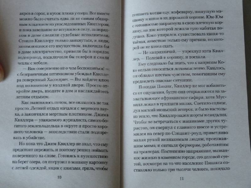 Убийство более чем загадочное. Квиллеру нет покоя от них даже на летнем отдыхе у озера. Расследование происходит между ожиданиями ремонтных рабочих. Стоит читать, даже если вы не любите детективы. Лёгкое чтение несмотря на количество убийств. Происходящее наводит на ассоциации с мисс Марпл. Она и репортер едины в том,...