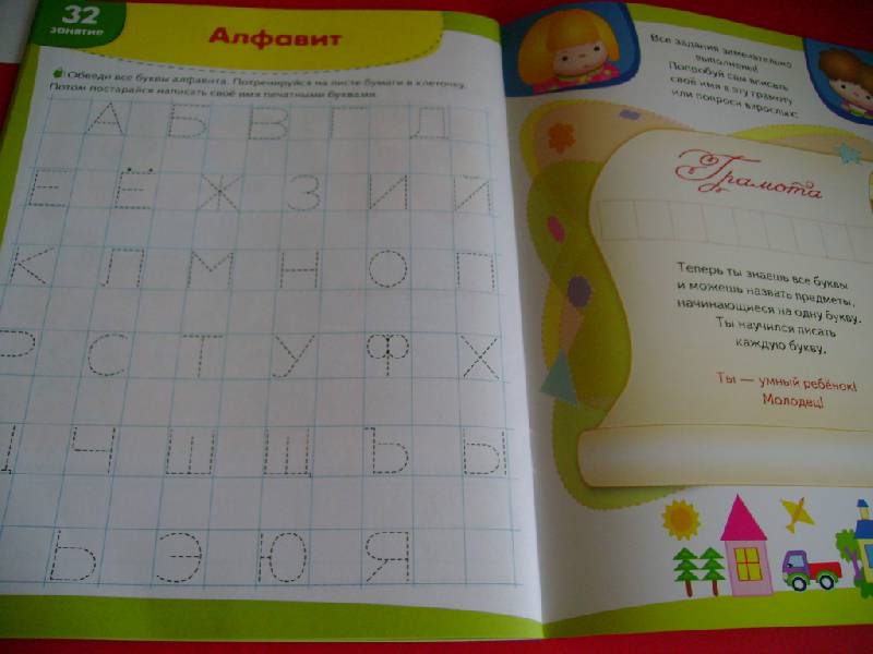 Нам очень понравилась тетрадь. Очень хороша для развития моторики.Мы купили ребенку 4-х лет, с удовольствием обводит и дописывает буковки, все это оформлено стишками, картинками и заданием раскрасить картинку. Мы сначала изучаем-повторяем буквы-звуки по "Азбуке Григория Остера", а затем пишем в тетрадке с бо...