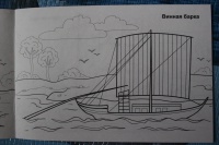 Хорошая в общем раскраска, картинки реалистичные (художник Шигаев Н.). Контуры рисунков жирные, детали предметов мелкие. Все мачты парусников даже уже прорисованы чёрным. Остаётся только раскрасить борт корабля и паруса. Ну и воду конечно же. Но зато целых восемнадцать парусников разных исторических периодов.
