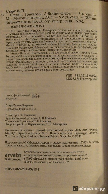 Какое счастье, что я нашла и купила книгу Вадима Петровича Старка о Наталье Николаевне. Ведь к нам в Алматы не все книжные новинки доходят. Замечательная книга. Спокойное, аргументированное повествование о жене и подруге поэта. Книги Ободовской и Дементьева, Натальи Горбачевой,Рожновых, Черкашиной мне тоже нравятся, ...