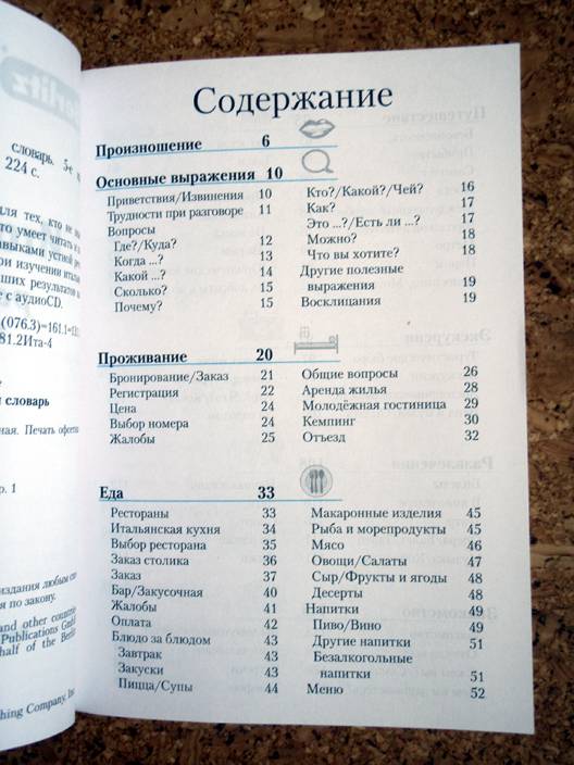 Разговорник разбит на несколько тем (см. фото страниц с содержанием):