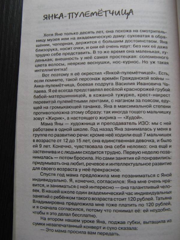 Более чем скромная с виду книжечка. Но это тот случай, когда внешность обманчива. Читается книжка так, что оторваться невозможно. Написано красивым языком. Рассказы о детях школьниках. Какими их видит учитель. Но учитель необыкновенный. Мудрый, внимательный и бесконечно добрый к детям. Ни мне, ни моим детям пока такие...