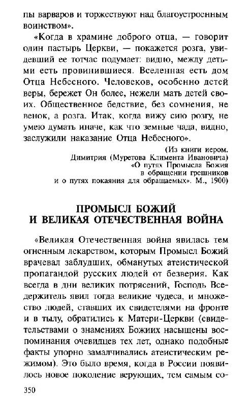 Книга представляет собой сборник очерков, эссе, фрагментов книг периода, в основном, 19-нач.20 вв. (и современности), написанных духовными лицами, и посвящена вопросу действия Промысла Божия в жизни отдельных личностей и всего человечества. Рассматривается и само понятие Промысла. Чтение – не из лёгких, т.к. придется ...