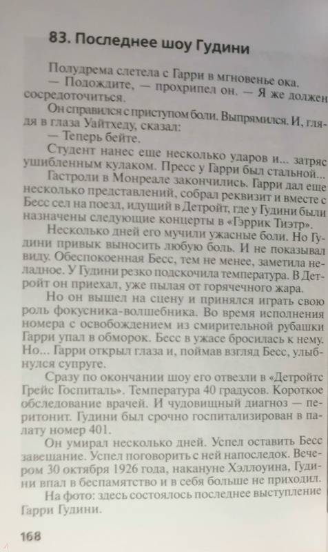 В книге представлена беллетризованная биография знаменитого американского иллюзиониста Гарри Гудини. Личность этого человека окружена многочисленными легендами, что для профессионального фокусника, пожалуй, лучшая из возможных наград. В этом же суть профессии – превращать обычное в необыкновенное, очевидное в загадочное, заурядное в магическое. При жизни с популярностью Гудини не могли сравниться ни миллионеры, ни политики, ни деятели культуры. Он был первой настоящей звездой в истории Америки. И первым фокусником, получившим общемировую известность. Жизнь Гудини это история бесконечного преодоления - себя, обстоятельств, обывательской инерции. Знаменитый мастер трюков своими блистательными представлениями показывал миру, что человеческие возможности безграничны. И что не стоит искать волшебства там, где его нет и быть не может. При этом многие современники воспринимали Гудини именно как волшебника… Биографические рассказы о Гарри Гудини иллюстрированы редкими фотографиями, сделанными в разные периоды его жизни.