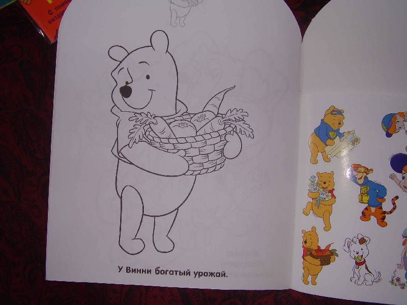 Содержит черно-белые иллюстрации для раскрашивания, подписи к каждой картинке и 16 наклеек.