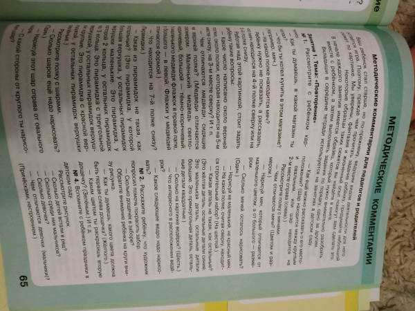 Очень огорчена, что в этом издании методические рекомендации поместили не в середину как раньше, а в конец. Раньше можно было ослабить скрепки и вытащить рекомендации, чтоб у ребенка, грубо говоря, была своя книжка, а у меня своя... А теперь придется листать книжку что ли... Очень неудобно!