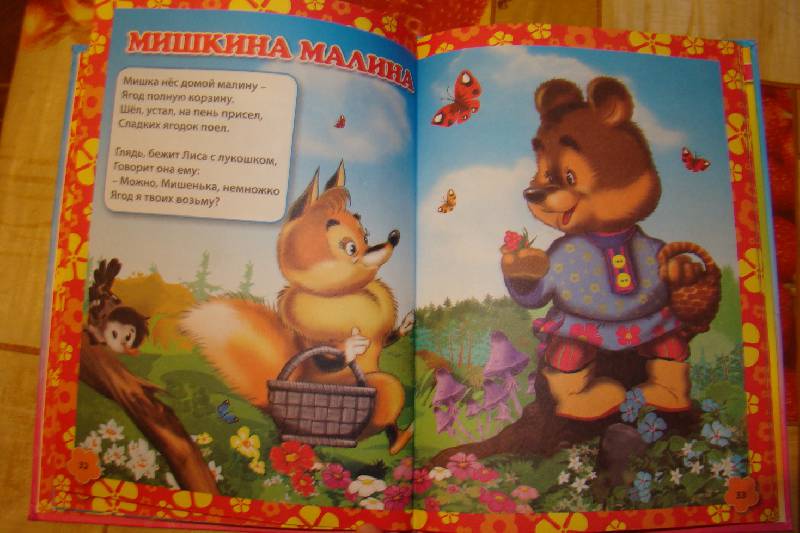 книга содержит 7 небольших, простых для понимания детей, стихов В. Степанова. оформление каждой страницы очень красивое. каждый разворот украшен цветастой рамкой. иллюстрации крупные и яркие, звери на них узнаваемые. крупный шрифт на каждой странице на белом фоне и в рамке. об листы нельзя порезаться. обложка красоч...