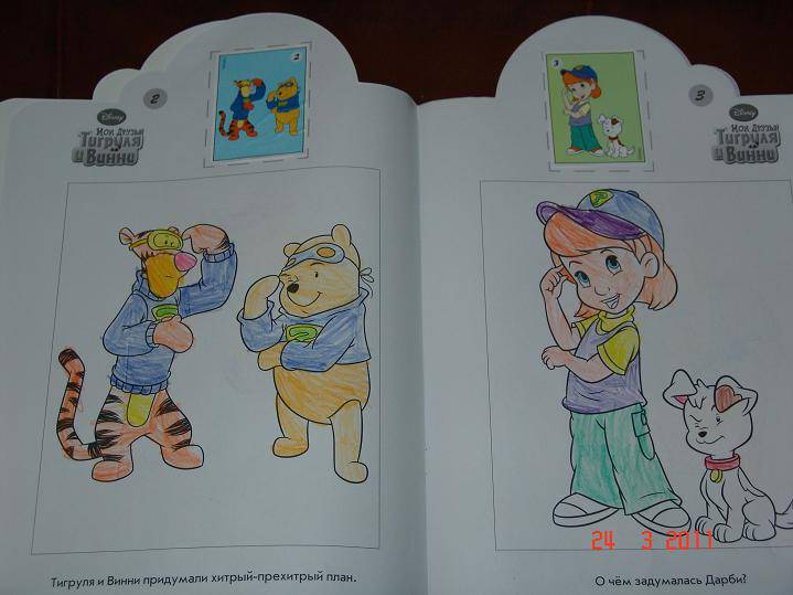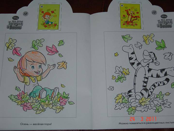 В этой замечательной книжке тебя ждет встреча с Тигрулей, Винни и их друзьями. И это не только чудесный альбом с наклейками, но и прекрасная раскраска! Чтобы правильно раскрасить картинки, тебе нужно: