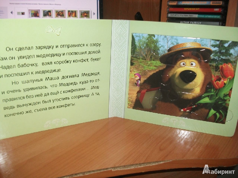 Прочная качественная книга среднего размера. Страницы из толстого картона, добротный переплет, удобные окошки для вынимания пазлов. Единственный минус - иллюстрации, в реале они гораздо темнее, т.к. фото сделано со вспышкой. Однако, маленькие любители Маши и Медведя в любом случае будут от издания в восторге! Книга це...