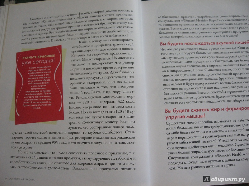 Шикарная великолепная книга! Идеальна для любительниц журналов, потому что очень похожа на журнал. Здесь не только упражения, питание и советы по уходу за собой, но еще и репортаж с забега нудистов, интервью с исполнительницей бурлеска, восхитительные фото, какими они бывают в глянцевых журналах. После чтения книги ос...
