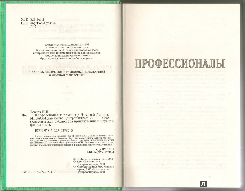 «Профессионалы» - книга известного советского и российского писателя Николая Ивановича Леонова (1933-1999) включает в себя три детективных романа – «Профессионалы», «Ещё не вечер» и «Бесплатных пирожных не бывает», которые посвящены работникам Московского уголовного розыска.