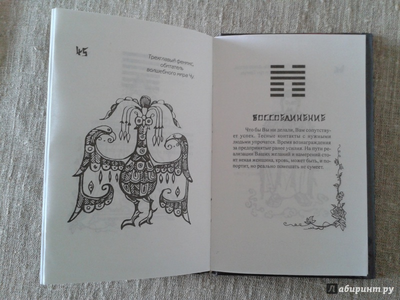 Книга небольшого формата, в твердом переплете, удобно расположен текст - значение каждой гексаграммы на отдельной странице. В конце книги специально отведены страницы для личных записей о гаданиях по этой книге.