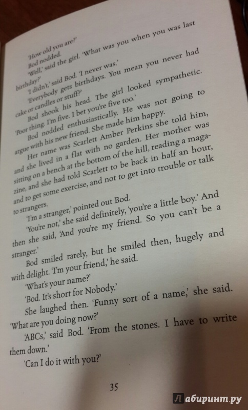 Нейл Гейман как всегда поражает глубоким смыслом и новизной.Книга очень понравилась мне и содержанием и обложкой.Приятно читать, хочется продолжения.Очень необычная история жизни мальчика среди мертвых.Захватывает.