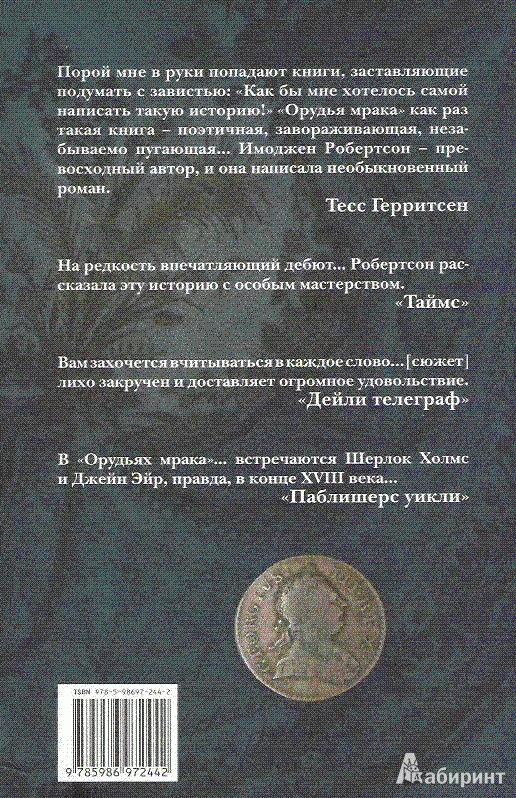 "Орудья мрака" сочетают в себе пугающую атмосферу лучших книг Дафны Дю Морье и захватывающие анатомические детали, отличающие произведения Тесс Герритсен. Это изысканный исторический роман о страшных семейных тайнах, безудержных страстях, дружбе и любви, уносящий читателя в мрачную реальность Георгианской эпохи.