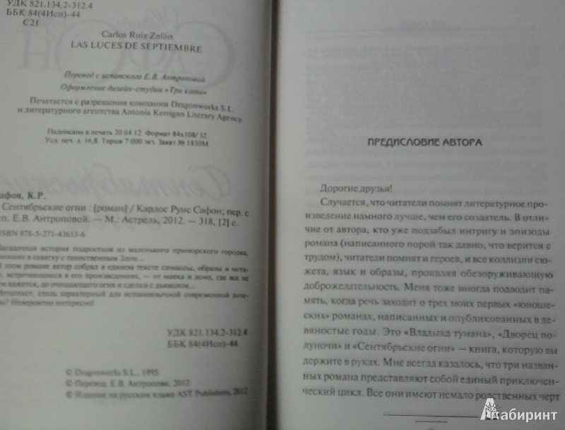 Карлос Руис Сафон "Сентябрьские огни"... В предисловии автор оправдывается - мол, это один из ранних романов. И в процессе чтения становится ясно, что извиняться перед читателями есть за что: излишне слащавая описательность, зашкаливающее количество роялей в кустах, на грани сверхвозможностей выживаемость гл...