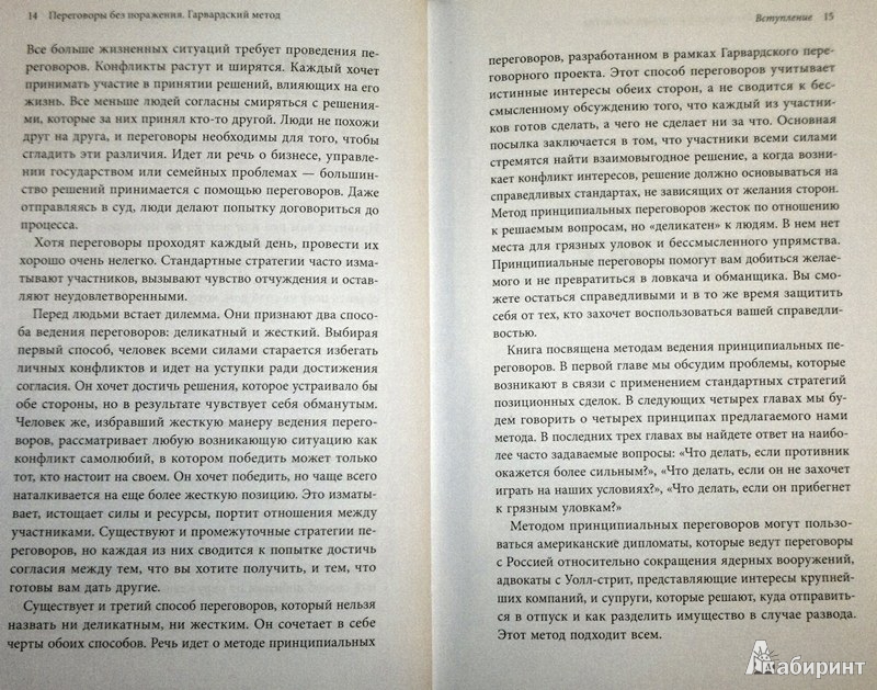 Авторы, ведущие специалисты Гарвардского переговорного проекта, предлагают простой и доступный метод принципиальных переговоров, который учит воспринимать оппонентов как соучастников решения проблемы, а не как собственных врагов. Метод принципиальных переговоров можно использовать в любых ситуациях - от обсуждения семейных планов на отпуск до решения международных конфликтов.