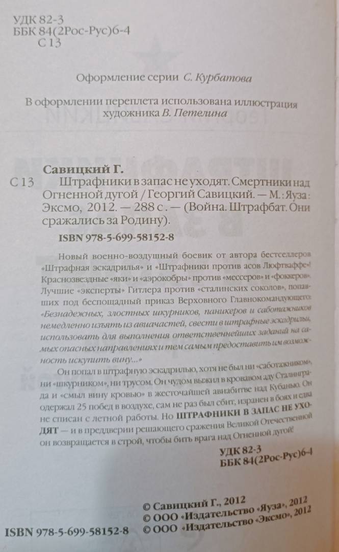 Ну что сказать про книгу? В какой то момент сложилось ощущение,что читал переиздание старого произведения...В другой момент -- что читал не художественное произведение, а справочное- типа энциклопедии военной авиации.Поскольку текст перенасыщен техническими данными самолётов.Да,книга интересная,но почему нужно было в ...