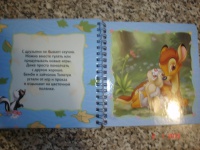 Очень толстенькие картонные странички, пружинка-переплёт, яркие картинки делает эту книжечку одной из любимых у малышей 2-3 лет. Оформление диснеевское. В тексте только описание того что нарисовано на картинке. Прикладываю фотографии всех страничек.